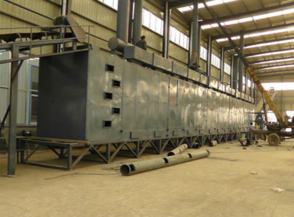 箱式網(wǎng)帶烘干機(jī)工作原理: 機(jī)頭電機(jī)帶動(dòng)減速器減速后傳至主動(dòng)齒輪、主動(dòng)齒輪帶動(dòng)過后引夾板(鏈條)、(夾板由托桿來控制寬度,托桿上邊鋪著耐高溫的網(wǎng)帶),在夾板(鏈條)的帶動(dòng)下網(wǎng)帶承載球團(tuán)緩緩做單向運(yùn)動(dòng)。球團(tuán)在進(jìn)料口卸入即進(jìn)入高溫區(qū),在移進(jìn)過程中與熱空氣接觸脫除水份,在大約移進(jìn)40-60分鐘后(速度可調(diào))在出料口卸出。此部份主要由被動(dòng)齒輪、自動(dòng)漲緊裝置、進(jìn)料、和機(jī)架組成。 網(wǎng)帶烘干機(jī)主要技術(shù)參數(shù)